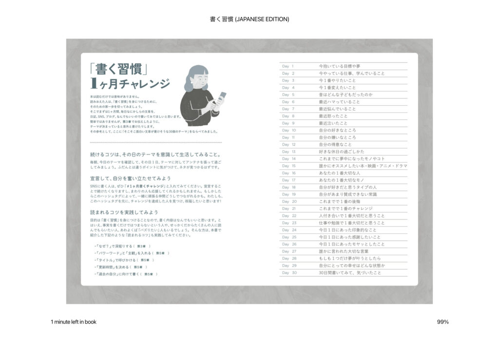 最初は「書きたいことがないんだよなぁ…」と困っていたら、ありがたいことに「書く習慣」1ヶ月チャレンジというページが巻末にあった。